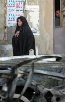 Iraqi woman walks past the wreckage following a car bomb explosion in Baghdad, Thursday, Feb. 16, 2006. Attacks around the country killed 14 people, including six Iraqis in a car bombing and three sheiks in a drive-by shooting. [AP] |