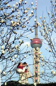 A photographer snaps the city flower — the white magnolia — on the Bund as warmer weather brings out the blooms. Skies will be sunny today but a bit cool, with temperatures between 5 and 10 degrees Celsius. Rain is expected to return for the weekend. |