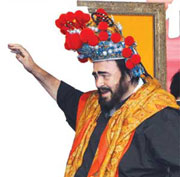 | Italian opera star Luciano Pavarotti wears a Peking Opera headdress presented to him after a news conference in Beijing yesterday. Pavarotti will hold a concert tomorrow in Beijing as part of his round-the-world farewell tour concerts that will end with his retirement. |