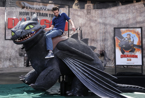 Cast member Jay Baruchel rides a mechanical dragon at the premiere of the film "How to Train Your Dragon" in Los Angeles March 21, 2010.[Agencies]
