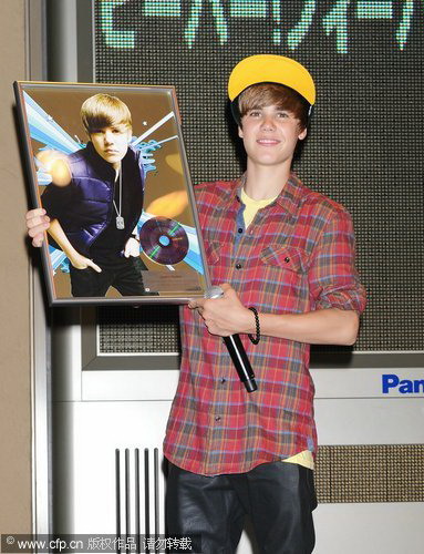 Singer Justin Bieber poses with the gold disc at his fan event at La Qua Garden amusement park on October 13, 2010 in Tokyo, Japan. [Photo/CFP]