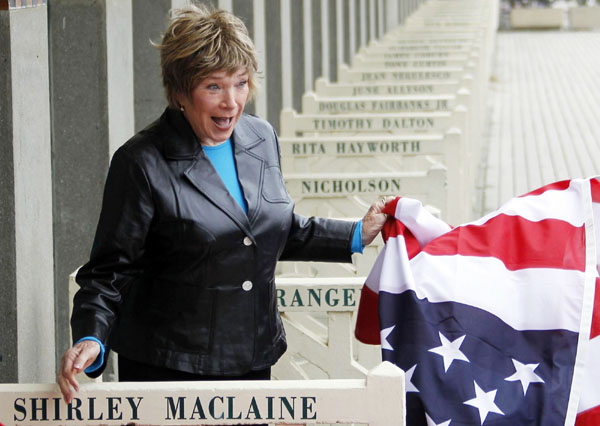 U.S. actress Shirley MacLaine poses with a U.S. flag next to barriers with names of actors along a beach in Deauville during the 37th American Film Festival in Deauville September 4, 2011. The festival pays tribute to the career of MacLaine.[Photo/Agencies]