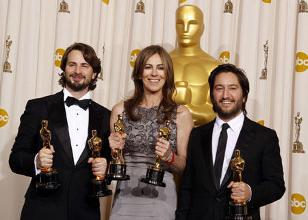 Best motion picture winners Boal, Bigelow and Shapiro for the film The Hurt Locker display their Oscars at 82nd Academy Awards in Hollywood.[Agencies]