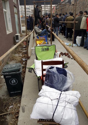 Folding chairs are lined up to save seats at a real estate agency in Qingdao, Shandong province, April 4, 2010. [Photo/CFP]