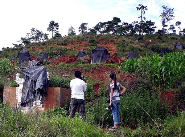 Journalists take photos of tombstones covered in black cloth in Yiliang county of Southwest China's Yunnan province, July 22, 2010. Local residents said the village governance ordered them to cover their families' tombstones with black cloth or paint them green or black so the mountains could have a more unified color. A staffer at the sub-district offices of a village said "higher-level officials" ordered them to urge the villagers to do this, but the county government denied they had given such instructions. Some of the green tombstones have been painted back to white as public confusion spreads. [Photo/Xinhua]