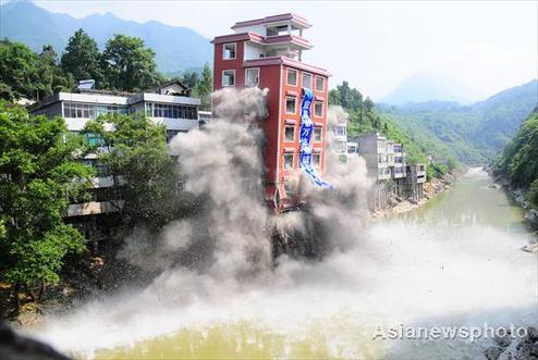 A seven-story illegal building is demolished by a blast along a river in Hefeng County, Central China's Hubei province on July 29, 2010. The illegal building is surrounded by homes, so local authorities dispatched technical professionals to check on the resident's houses and made a plan to clean up the debris in the river after the blast. [Photo/Asianewsphoto]