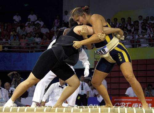 ![]() Alina Maksimenko (R) of Ukraine and Ai Fujiwara of Japan compete during the women's sumo wrestling competition at the Combat Games in Beijing August 28, 2010. [Photo/Agencies] |