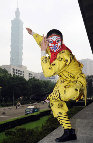 A street performer does a monkey pose at Yixian Park in Taipei, Taiwan, Nov 21, 2010. [Photo/Xinhua]