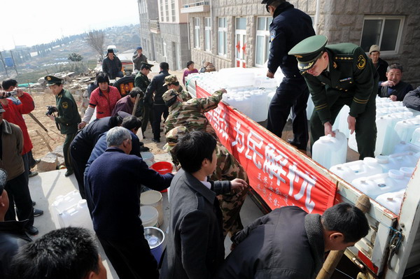 Police officers distribute drinking water for residents in Laoshan district of Qingdao, East China's Shandong province, Feb 17, 2011. [Photo/Xinhua]