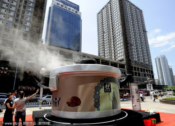 A huge pot is on display in front of a shopping center in Shenyang, the capital of Northeast China’s Liaoning province, June 13, 2011. Four meters in diameter, the pot is 200 times the size of a normal household one. [Photo/CFP]