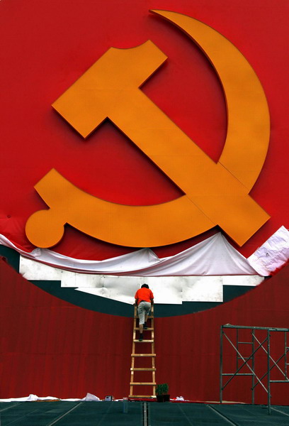 A worker climbs down a ladder as he paints a giant communist emblem as part of a display on Beijing's Tiananmen Square June 27, 2011. [Photo/Agencies]