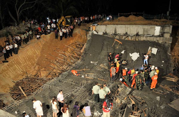 Firefighters in Wanning, South China's Hainan province, search on Monday amid the debris of the Taiyanghe Bridge, which was under construction and collapsed on Monday afternoon. The accident killed two construction workers and injured two others. The cause of the accident is under investigation. [Photo by Luo Yunfei/China News Agency] |