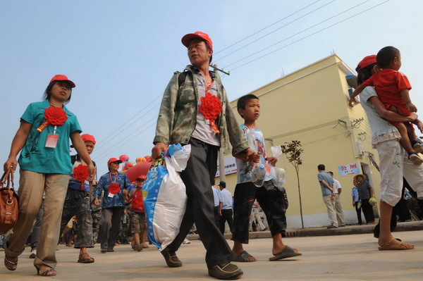 Emigrants from Xichuan county, Nanyang city move to a settlement in Xiangcheng county, Central China's Henan province, Aug 25, 2011. On that day, 1,192 people evacuate their homes in Xichuan, a county that is to be submerged by the Danjiangkou Dam project, which is part of the South-to-North Water Diversion Project. They are among the last group of Henan people to have been evacuated for the Danjiangkou Dam project. [Photo/Xinhua]