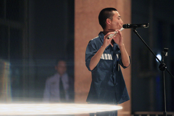Wang Gang, a 26-year-old inmate who is about to complete an 8-year jail term, performs at a special concert held for him by the Xinxiang Prison in Henan province, June 2, 2011. He turned to music after being in prison and wrote songs himself. [Photo/CFP]