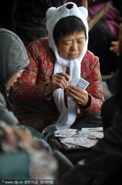 A woman plays poker to pass the waiting time at Guangzhou Railway Station in Guangzhou, South China's Guangdong province, Jan 4, 2012. [Photo/CFP]