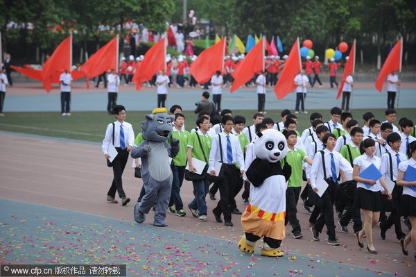 Students at Chongqing University dress up in various costumes for the ceremony of the university's spring sports meeting in Chongqing, April 13, 2012. [Photo/CFP]