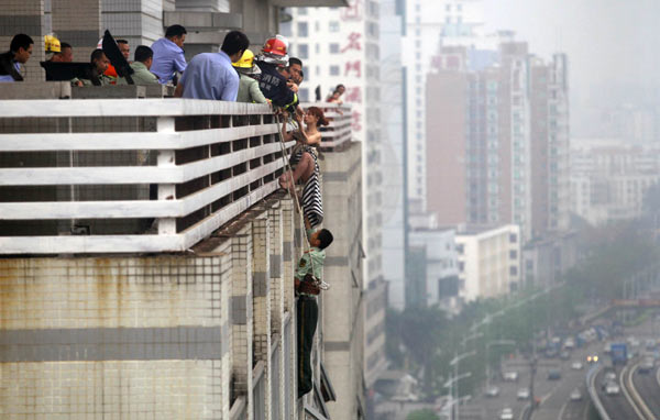A woman attempts to commit suicide by jumping from the 12th floor of a building, as police officers and firefighters come to the rescue in Dongguan, Guangdong province, on April 18, 2012. Rescuers tried to persuade the woman not to proceed with her attempt, and after three hours, she cooperated with them. [Photo by Fang Guangming/ For China Daily]