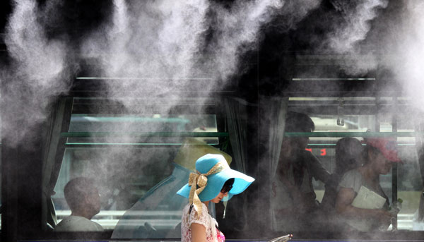 A passenger waiting for her bus gets a cool spray at Lingyin Bus Station in Hangzhou, the capital of Zhejiang province on July 2. [Photo/Asianewsphoto]