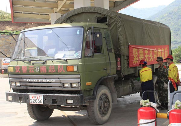 An armed police forces truck carrying supplies gets refueled in Yiliang county, Southwest China's Yunnan province, Sept 10, 2012.[Photo/Xinhua]