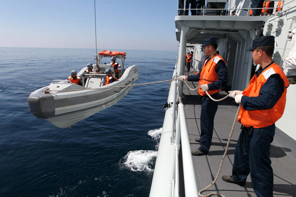 The command ship Harbin lowers a launch boat during a combat rescue drill of China’s 14th escort fleet on March 10 in the Arabian Sea. [Photo/Xinhua] |