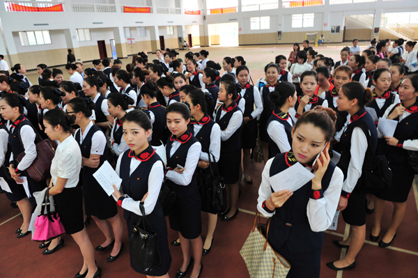 College students apply to become flight attendants for China Southern Airlines in Haikou, capital of South China's Hainan province, March 14, 2013. China Southern kicked off its 2013 recruitment in Haikou. It plans to recruit 96 flight attendants from Hainan, and altogether 1,000 from 12 cities across the country. [Qi Fan/Asianewsphoto]