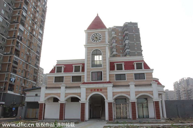 A public toilet with European-style architecture in Wuhan, Hubei province, March 29, 2014. The toilet has two stories and a clock tower. This is not the first luxury toilet in the city. In December, 2012, a similar toilet that cost 800,000 yuan ($129,000) to build provoked criticism. In 2013, some political advisers suggested the quantity of toilets was more important than quality, since the city still has a shortage of more than 800 public toilets. [Photo/icpress.cn] |
