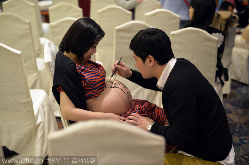A prospective father paints his pregnant wife’s belly during a body painting contest at Chongqing Institute for Women’s and Children’s Health on Nov 2. [Photo/IC]