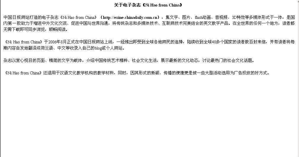 About Ni Hao from ChinaUpdated: 2007-06-21 09:21 Ni Hao from China, an electronic magazine launched byChinadaily.com.cn is the first English e-zine on Chinese culture in China. It brings a new experience to Chinese culture aficionados with its advanced use of the latest technologies, animations, videos, audio segments, and photos. To date, we have received hundreds of emails from people in more than 40 countries. Some of our readers have translated the contents of the ezine into Dutch and Chinese and posted them on their individual websites and blogs. Ni Hao from China not only introduces China's traditional arts, customs, but also shows the latest culture trends, and discusses the hottest social topics. Ni Hao from China would make suitable material for a language school, while its advanced design and growing popularity make it prime advertising space.