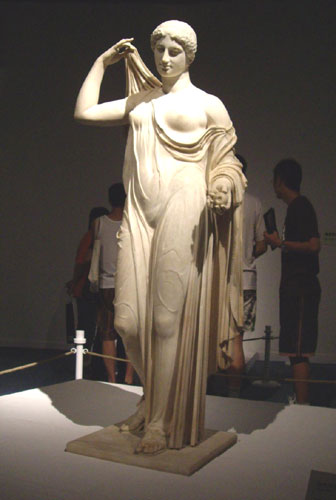 Statue of Aphrodite, standing with veil raised and holding an apple.
