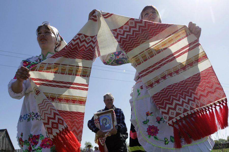 A villager carries an icon of the Mother of God behind women carrying a scarf during a ritual celebrating the pagan god Yurya in the village of Pogost, some 250 km (155 miles) south of Minsk May 6, 2013. Locals believe that Yurya protects their harvest, and the annual tradition on May 6 is devoted to praying for plentiful future harvests.[Photo/Agencies]