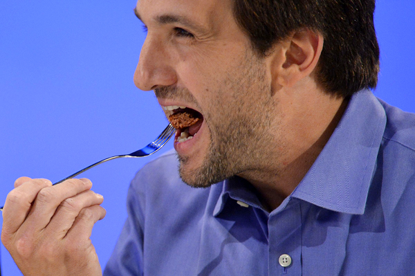 Josh Schonwald, a US-based food writer, tastes the world's first lab-grown beef burger during a launch event in west London, August 5, 2013. [Photo/Agencies] |