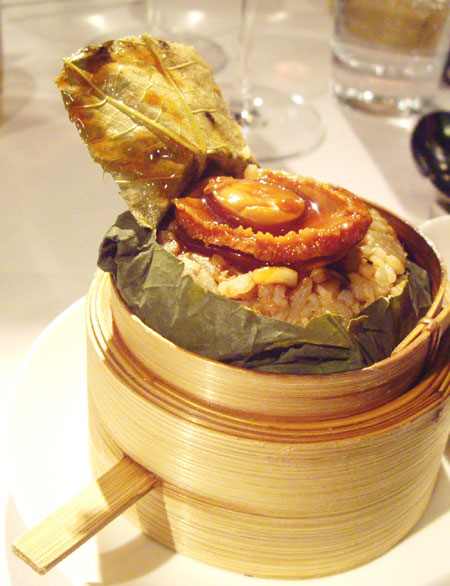 We finished with steamed fried rice with whole Australian abalone and wild fungus wrapped in lotus leaf. The individual bamboo steamers were a lovely touch, and a mini marinated abalone emerging from the leaf provided the crown to a hearty crab dish.