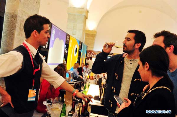 A visitor tastes Portuguese wine during the Lisbon Fish and Flavours Festival in Lisbon, Portugal, on April 12, 2014. The festival is held from April 3 to April 13. [Photo/Xinhua] |