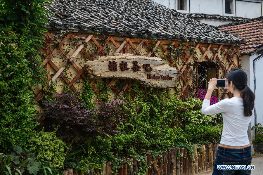 A tourist takes photo of the "swinery tea bar" in Dipu village of Jiangnan town in Tonglu county, east China's Zhejiang province, May 13, 2014. Dipu village, a national historical and cultural village with nearly a thousand years' history, has committed to environment reform, village protection and tourism development for the past few years. The "swinery tea bar" sets a successful example of the transform. The bar used to be five messy stone houses for pigs keeping. After renovation, it functions as a modern tea bar with traditional appearance, attracting many tourists since it opened in early May. [Photo/Xinhua]