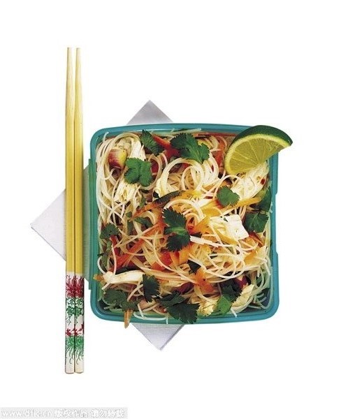Vietnam cold rice noodles. The savory noodles are usually dressed in lime juice and garnished with coriander leaves and a lime wedge. They're good as an appetizer or a snack.