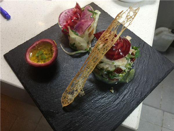 Fish tartare with crunch vegetable and passion fruit. [Photo provided to China Daily] |
