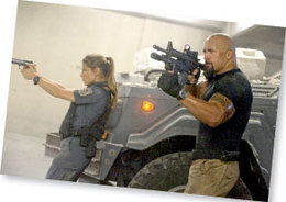 Rio cop Elena (Elsa Pataky) and FBI agent Hobbs (Dwayne Johnson) with really fast cars and big guns in Fast Five. |