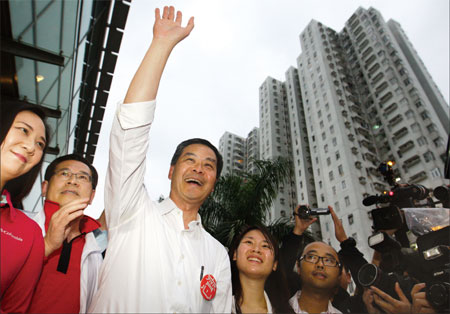 Chief Executive-Elect Leung Chun-ying waves to residents in Tai Wai when he visited the area situated in Sha Tin District on Friday. Leung said he will continue to listen to appeals from local communities with a humble heart. Photo Provided to China Daily