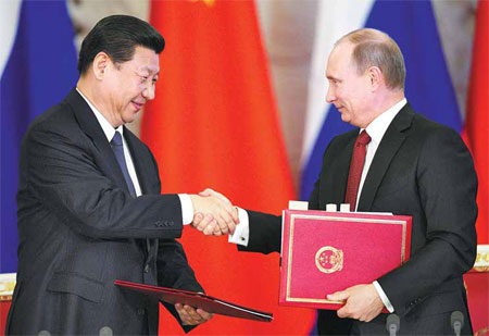 President Xi Jinping shakes hands with Russian President Vladimir Putin during a document signing ceremony in Moscow. Alexander Nemenov / AFP