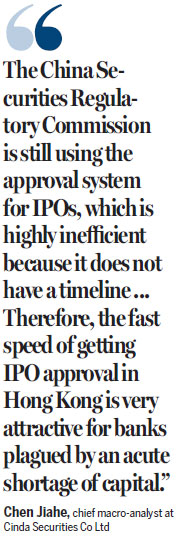 "The China Securities Regulatory Commission (CSRC) is still using the approval system for IPOs, which is highly inefficient because it does not have a timeline," said Chen Jiahe, chief macro-analyst at Cinda Securities Co Ltd. "It may take years for an applicant to gain approval. Even a short cut may take a year or two. Therefore, the fast speed of getting IPO approval in Hong Kong is very attractive for banks plagued by an acute shortage of capital."