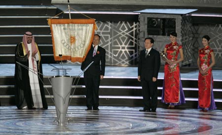 Guangzhou's Mayor Zhang Guangning (3rd L) and Olympic Council of Asia President Sheikh Ahmad Al-Sabah (L) watch as Chinese National Olympic Committee chairman Liu Peng carries the Asian Games flag during the closing ceremony of the 15th Asian Games in Doha December 15, 2006. [Reuters]