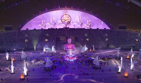 Performers dance under a figure of Ali Baba during a rehearsal for the closing ceremony of the 15th Asian Games in Doha December 14, 2006. [Reuters]