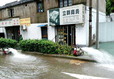 Updated: 2007-09-19 07:59 ![]() A pumper pumps water on aflooded street in Taizhou, East China's Zhejiang Province September 18, 2007. Much more heavy rainfalls are about to hit the province as Typhoon Wipha makes landfalls in the East China provinces. [newsphoto]