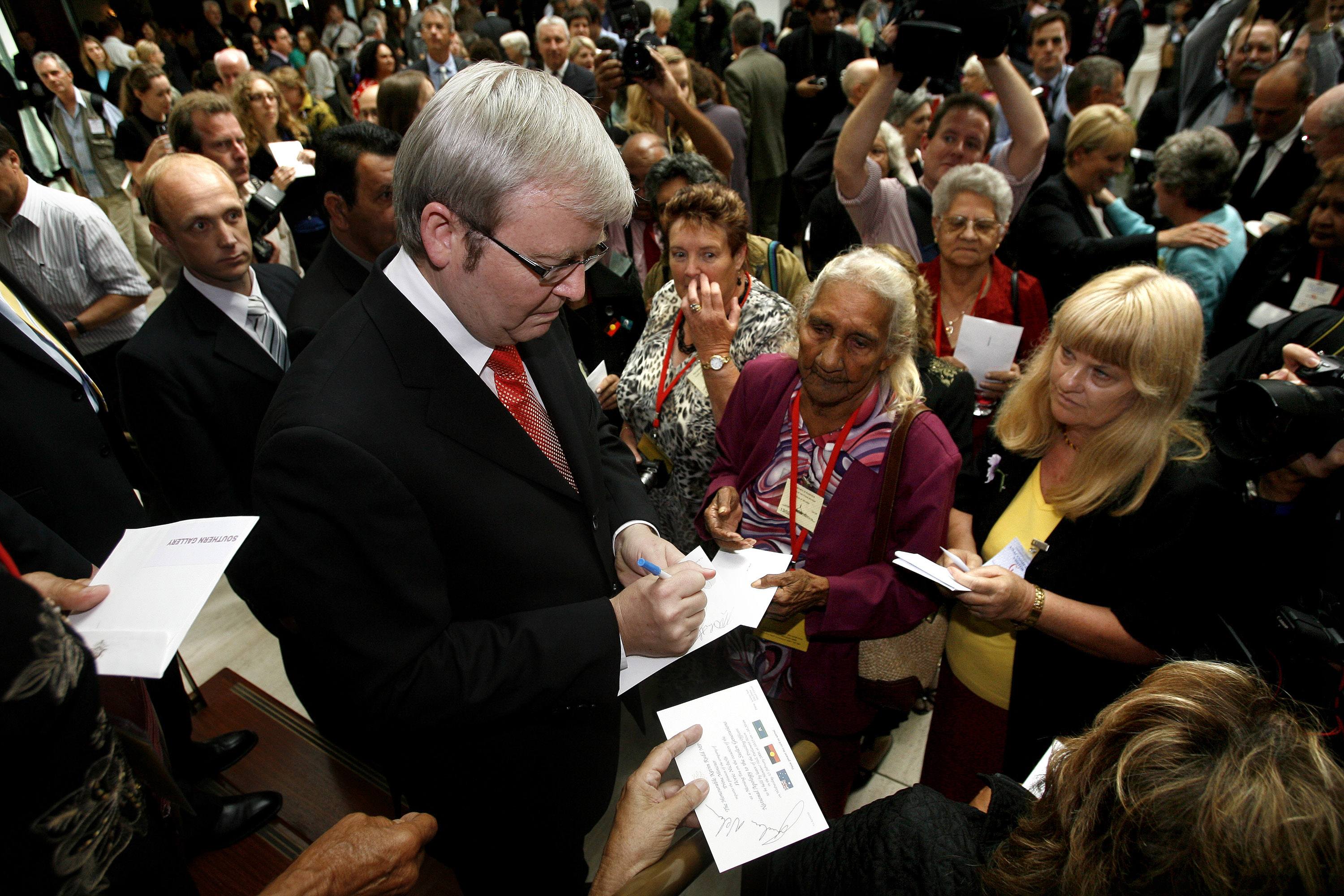 | Prime Minister Kevin Rudd signs autograph for members of the Aboriginal stolen generation at Parliament House in Canberra February 13, 2008. Australia apologised for the historic mistreatment of Aborigines on Wednesday, moving many aborigines to tears and prompting cheers from huge crowds gathered in cities across the nation. [Agencies] |