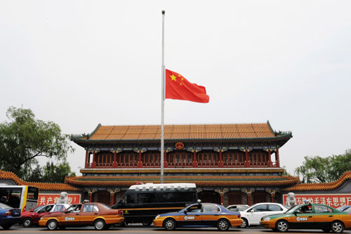 The Chinese national flag is flown at half-mast in front of Xinhuamen, the formal gate to the Zhongnanhai in Beijing May 19, 2008. Sirens wailed as China paused in grief at 2:28 pm on Monday, just the time when an earthquake struck Sichuan a week ago. The country began three days of mourning for more than 30,000 victims. [Xinhua]
