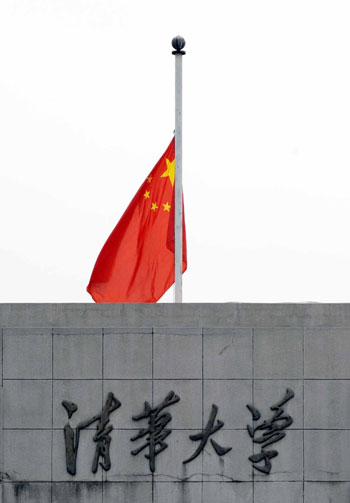 The Chinese national flag is flown at half-mast in front of Tsinghua University in Beijing May 19, 2008. Sirens wailed as China paused in grief at 2:28 pm on Monday, just the time when an earthquake struck Sichuan a week ago. The country began three days of mourning for more than 30,000 victims. [Xinhua]
