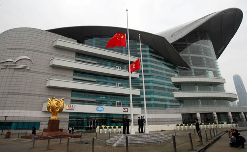 The Chinese national flag is flown at half-mast in front of the Golden Bauhinia Square in Hong Kong May 19, 2008. Sirens wailed as China paused in grief at 2:28 pm on Monday, just the time when an earthquake struck Sichuan a week ago. The country began three days of mourning for more than 30,000 victims. [Xinhua]