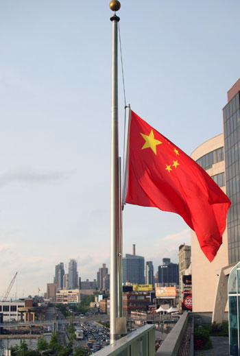 The Chinese national flag is flown at half-mast in front of the Chinese consulate general in New York May 19, 2008. Sirens wailed as China paused in grief at 2:28 pm on Monday, just the time when an earthquake struck Sichuan a week ago. The country began three days of mourning for more than 30,000 victims. [Xinhua]