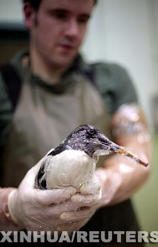 1月22日,在英国德文郡波特兰港,动物救助中心的工作人员为一只海鸟清洗油污