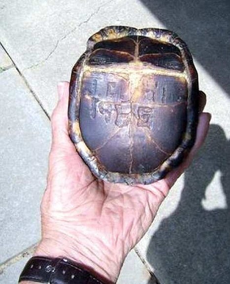 据英国《每日邮报》网站5月6日报道,1965年,居住在宾夕法尼亚州南斯特拉班市的13岁男孩杰夫·科克力在自己家后院发现了一只产于北美洲的箱龟,他在那只龟的腹部刻上了自己姓名的首字母JC和年份“1965”(刻字不会伤害龟,因为龟壳比较坚硬),然后就把它放生了。